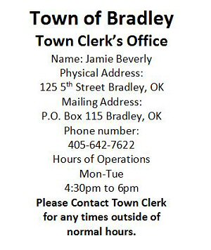 Bradley has a Board of Trustees form of government that is ruled by the Town Meeting Act. There are three board members and a Town Clerk. Biennial meetings are held on the first Tuesday of April every odd-numbered year to elect trustees and a clerk. Persons are nominated on the floor and elected at large during Town Hall elections (11 OS 12-103.1). The Town Clerk is a consolidated position which combines the duties of secretary and treasurer. All trustees and the clerk serve four year terms. Election Resolutions are posted at 5 locations visible to the public ten days prior to the election (11 OS 16-306.C). Voting is conducted at the Community Building at 7pm. The next Regular election in 2025 will be for Ward 2 and Town Clerk. The Regular election in 2027 will be for Wards 1 and 3. Special elections are conducted as needed following regular election procedures. Election results are not filed with the County Election Board. 2027 Regular Election CalendarMarch 17, 2027 - Salary ChangesAny change in salary for newly elected officials must be passed by ordinance fourteen (14) business days before the election. The salary change will only apply to those officials whose terms begin after the election. March 23, 2027 - Notice of Election ResolutionIn addition to the requirements of the Oklahoma Open Meeting Act, notice of the biennial town meeting and any special town meeting for the purpose of electing officers shall be given by publishing notice of the meeting stating the date, time, place and agenda at least ten (10) business days before the date of the meeting. The notice shall be given by posting the agenda in at least five (5) public places in the municipality. The notice shall list the offices to be filled, including the number of officers to be elected for four-year terms and the number of officers to be elected to fill unexpired terms, and the questions to be voted on, if any (11 O.S. Sec. 16-304). April 06, 2027 - ElectionA biennial town meeting of the voters shall be held on the first Tuesday in April in each odd-numbered year for the purpose of electing municipal officers and considering questions raised by initiative or referendum (11 O.S. Sec. 16-303). April 7-9, 2027 - Contesting ResultsAny person nominated for municipal office may, at any time before 5:00 p.m. of the third business day following the town meeting in which he or she was nominated, contest the correctness of the announced results of said election by filing a written petition with the district court of the county in which the municipality is located (11 O.S. Sec. 16-310). April 19, 2027 - Taking OfficeThe term of office for an elected official shall begin at 12:00 noon on the second Monday following the general municipal election (11 O.S. Sec. 8-102). Elected officials may be sworn in before that time. The oath of office may be taken outside of a meeting if a swearing-in ceremony cannot be arranged in a timely manner. Oaths can be administered by all officers authorized by state law including the mayor, municipal clerk, municipal judge and other such officers as the municipal governing body has authorized (11 O.S. Sec. 8-104). State law (Title 11 O.S., Section 8-114) requires each person elected or appointed for the first time as an officer of a municipality to attend an institute for municipal officials. TRANSITIONAL PROVISIONS FOR MUNICIPALITIES |