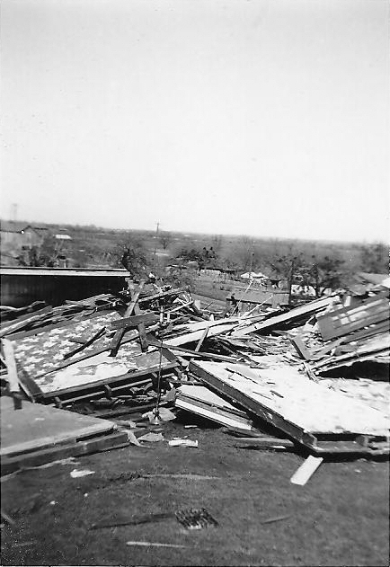 Damage in the Bradley area was estimated at $300,000. More than six homes and at least four businesses were leveled by the tornado. One of the first buildings hit was the post office and grocery store owned by Fritz Badertscher. One of the last buildings hit was the school. Frank Foley, superintendent estimated the damage in excess of $50,000. The roof was ripped off the gymnasium, while the lunchroom on the East Side of the structure was not touched. The tornado's only victim was Minnie Ione (Boozer) Coon (Winford Coon's grandmother) who died in the Lindsay hospital as a result of injuries sustained during the storm. The newspaper article said it was N.C. Childress, but they got her name wrong. Helen Wanda Childress was Winford's mother. This is the story as related by Winford's daughter, Shalene (Coon) Harris. "Winford was 14 when the tornado hit. He and his dad, Claude Coon had been working their farm all day. It was hot as hell. They went inside and Winford said the sky turned green. Winford's youngest sister was across the road staying with Minnie. Claude said, 'it's a tornado'. Winford ran towards what was Minnie's house and Claude stopped him and said, 'it's already gone.'"